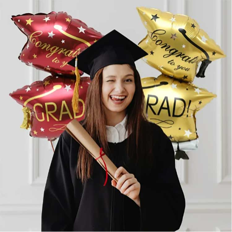 ลูกค้าสามารถทำลูกโป่งยางและฟอยล์ด้วยตัวเองได้ เพียงแขวนลูกโป่งรับปริญญาเหล่านี้ไว้บนผนัง เพดาน หรือทางเข้า เพื่อสร้างบรรยากาศงานปาร์ตี้ที่น่าตื่นเต้น