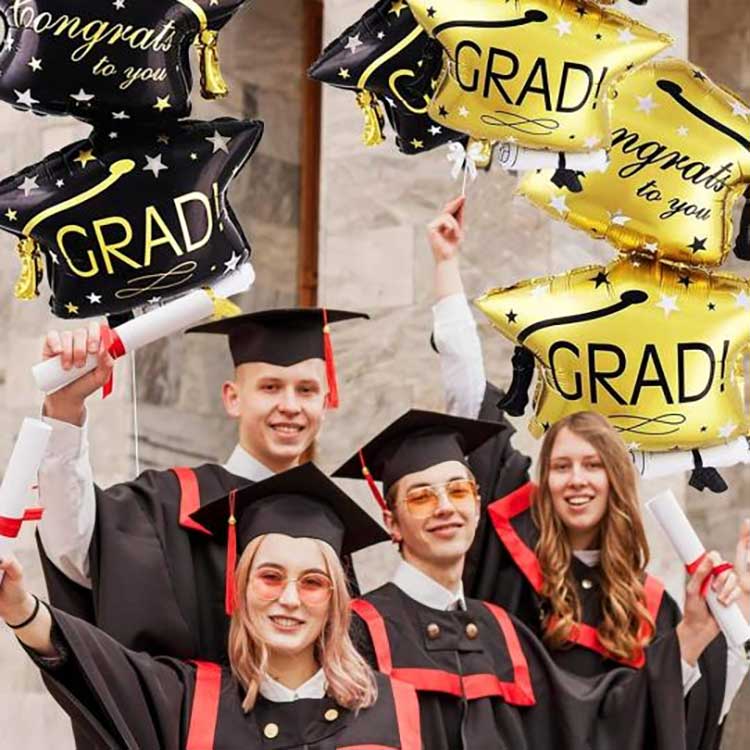 ชุดลูกโป่งรับปริญญานี้มีให้เลือกสามสี ได้แก่ สีดำและสีทอง เพื่อเพิ่มความเย้ายวนใจให้กับการสำเร็จการศึกษาของคุณ ลูกโป่งรับปริญญาสีทองเพิ่มความพิเศษให้กับเทศกาล