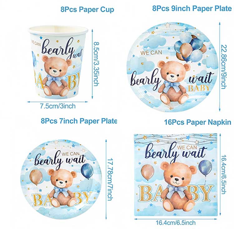 ขนาดชุดจานทิ้งสำหรับวันเกิดทารก:สินค้าบรรจุในถุง OPP แต่มีจำหน่ายบรรจุภัณฑ์กระดาษการ์ดด้วย เราสามารถปรับแต่งบรรจุภัณฑ์ได้ตามความต้องการเฉพาะของลูกค้า