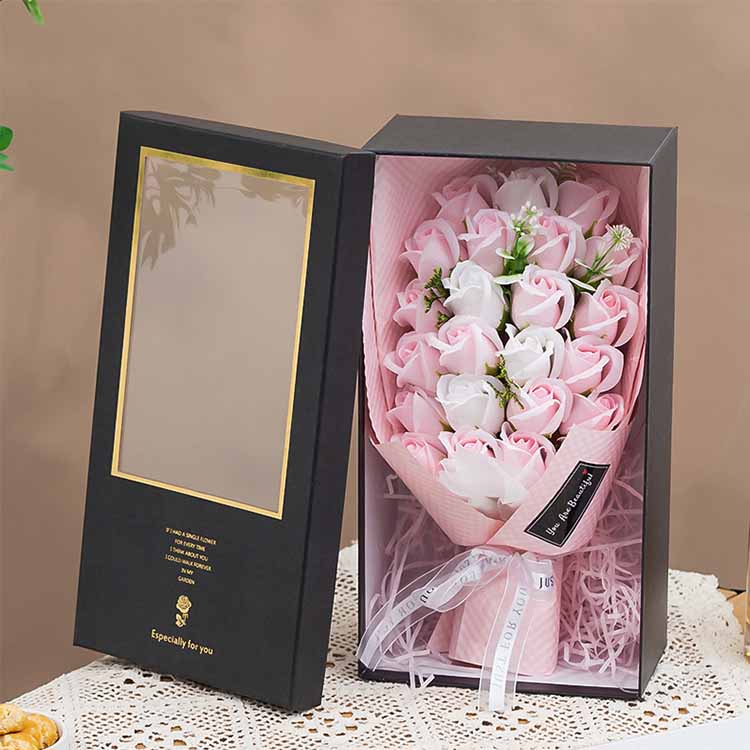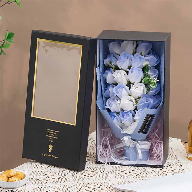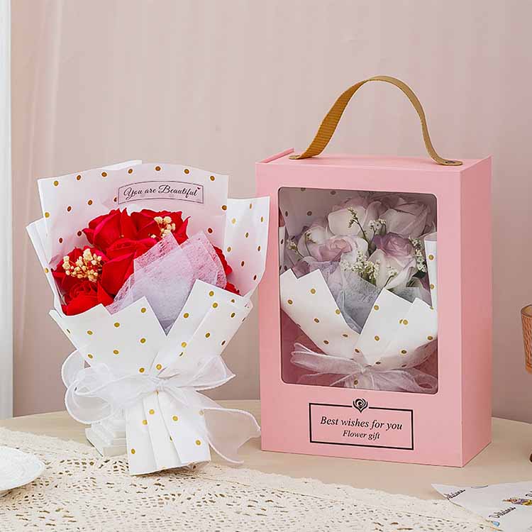 กล่องของขวัญช่อดอกไม้มีการปั๊มร้อน ขอบโปร่งใส และวัสดุนูน ซึ่งทำให้ดอกไม้มีชั้นและมีคุณภาพสูงมากขึ้น วัสดุที่ใช้คือกระดาษแข็ง การเคลือบ และวัสดุที่เป็นมิตรต่อสิ่งแวดล้อมซึ่งป้องกันแรงกดและป้องกันการเสียรูป ในช่วงเทศกาลใดๆ ลูกค้าสามารถซื้อได้ตามความต้องการซึ่งคุ้มค่ามาก