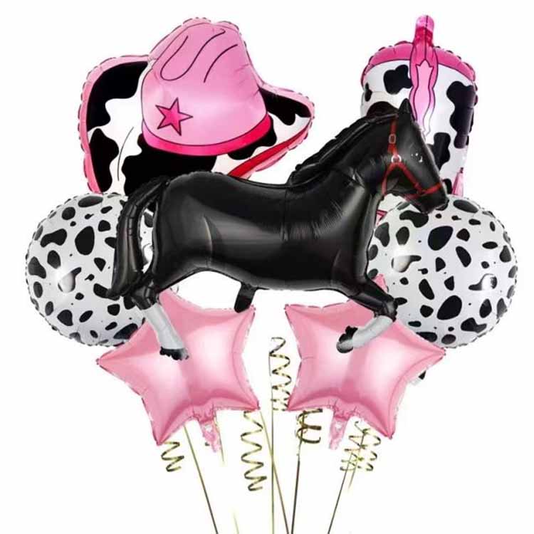 ด้วยรูปทรงของเส้นที่แม่นยำและการจับคู่สี ช่วยฟื้นฟูรูปทรงของกล้ามเนื้อและแผงคอที่พลิ้วไหวของม้าที่กำลังวิ่ง และโทนสีธรรมชาติทั่วไป เช่น สีน้ำตาลและสีดำจะเข้ากับภาพลักษณ์ที่แท้จริงของม้าได้ดีขึ้น ลูกโป่งฟอยล์ธีมคาวบอยบางรุ่นยังเพิ่มสีเมทัลลิก เช่น สีเงินและสีทองเพื่อเพิ่มความโดดเด่นให้กับภาพ ลายวัวมีลักษณะเป็นวงกลมโดยมีลายวัวสีดำและสีขาวพิมพ์อยู่และบางสไตล์ก็เพิ่มการตกแต่งสามมิติเช่นระฆังเล็กและพลูหาง sh ด้านล่างลูกโป่งอลูมิเนียมฟอยล์ที่ทั้งน่ารักและมีสไตล์แบบชนบทและเป็นธีมยอดนิยมสำหรับกิจกรรมคาวบอยสำหรับครอบครัว