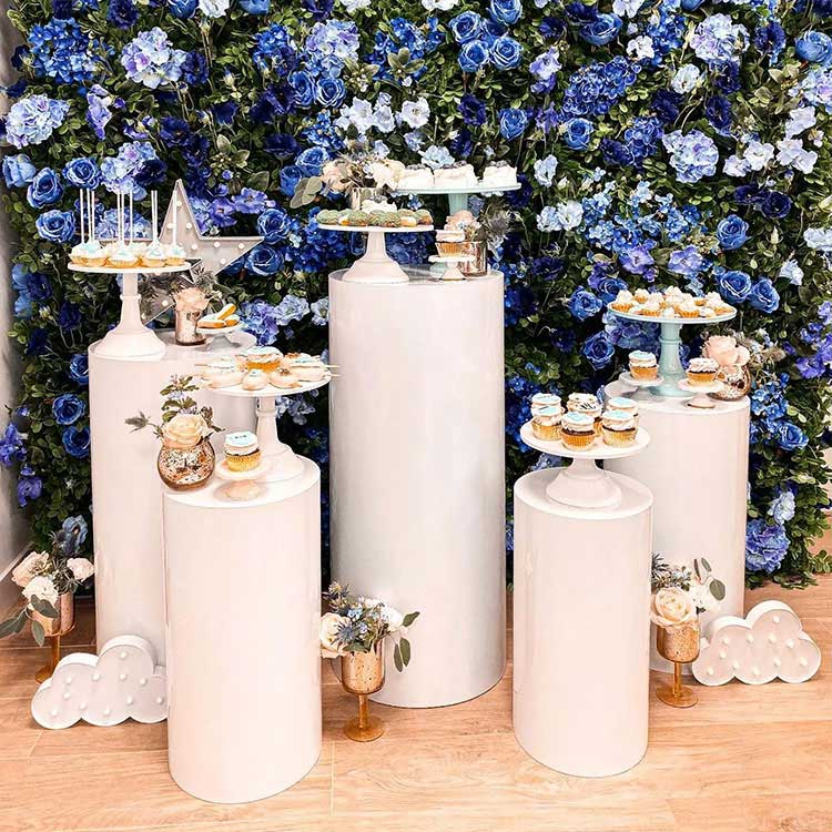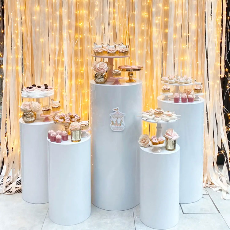 โต๊ะขนมฐานทรงกระบอกทำหน้าที่เป็นทั้งภาชนะและเครื่องประดับ โดยปกติแล้วจะมีหลายชุด เช่น ชุด 3 ชิ้น ชุด 5 ชิ้น ชุด 7 ชิ้น และอื่นๆ ชุดค่าผสมที่พบบ่อยที่สุดคือห้าชิ้น ท่อทรงกระบอกอิสระขนาดต่างๆ สามารถจัดเรียงได้อย่างยืดหยุ่น และเป็นส่วนสำคัญของฉาก ในเวลาเดียวกัน เรายังเสนอการปรับแต่งขนาดและรูปร่างด้วย ยิ่งไปกว่านั้น ยังเข้ากับการตกแต่งงานปาร์ตี้ของคุณอีกด้วย