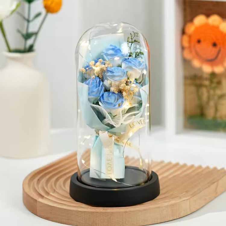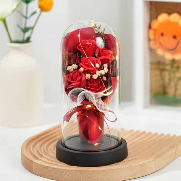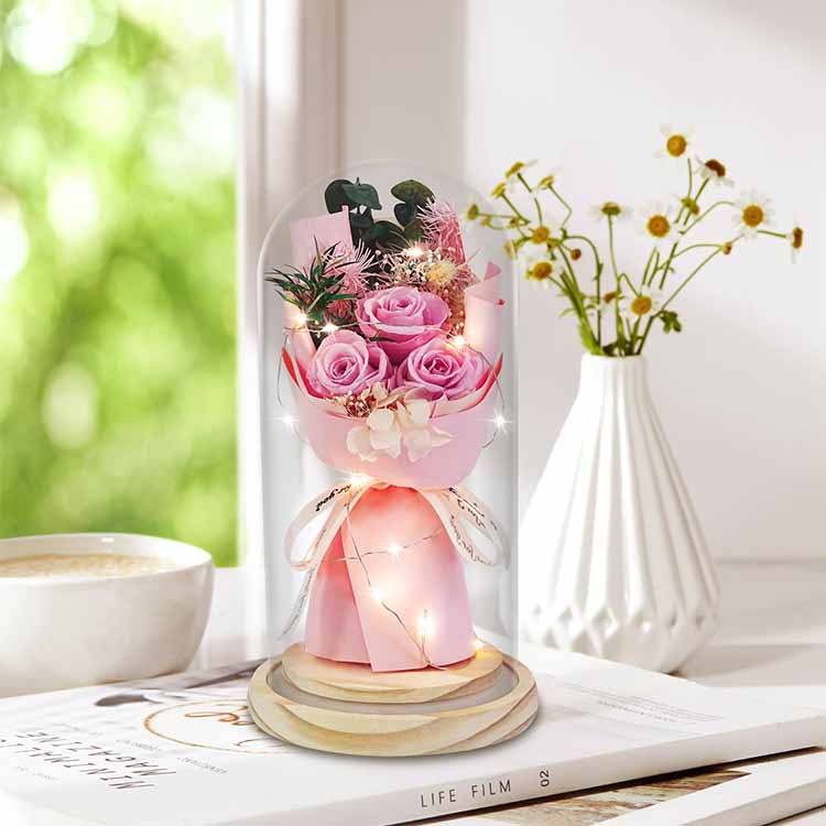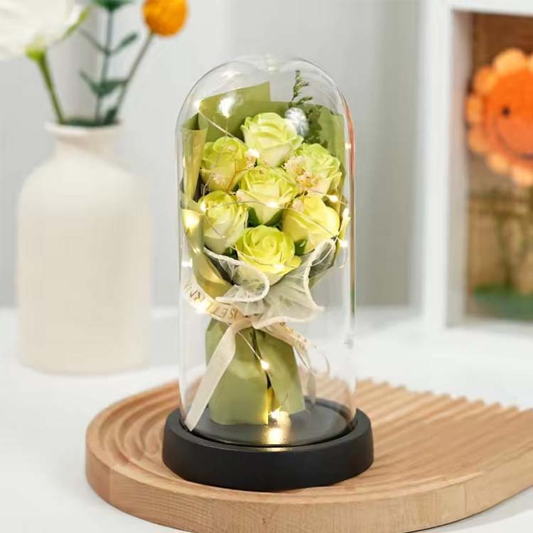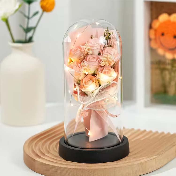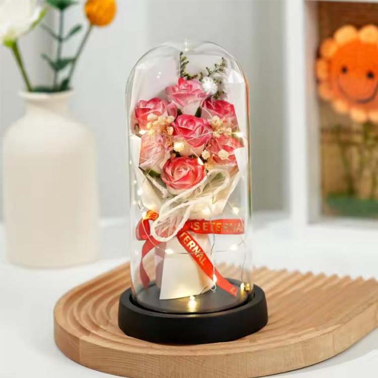 ช่อดอกกุหลาบสบู่โดมแก้วพร้อมไฟ LED ใช้ร่วมกับดอกไม้สบู่และดอกไม้ที่เก็บรักษาไว้ ไฟ LED ใช้แสงโทนอุ่นและไม่สะท้อนแสง ซึ่งสามารถเพิ่มบรรยากาศที่อบอุ่นเมื่อตกแต่งฉากได้ สายไฟ LED ในตัวยังมีไฟกระพริบหลากสีสัน และสามารถปรับแต่งสีได้ตามความต้องการของคุณ ช่อดอกไม้พร้อมฝาแก้วนี้สามารถใช้เพื่อจัดฉาก เช่น วันเกิด วันครบรอบ ขอแต่งงาน ฯลฯ และยังสามารถใช้เป็นช่อดอกไม้ ของขวัญดอกไม้นิรันดร์จะไม่เหี่ยวเฉาและจะไม่เปลี่ยนสีแม้จะมีฝาแก้วก็ตาม ดอกสบู่สามารถใช้ล้างมือหรือกลิ่นหอมได้ ช่อดอกกุหลาบนี้ประหยัดและใช้งานได้จริง