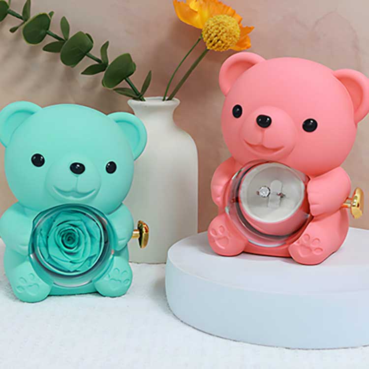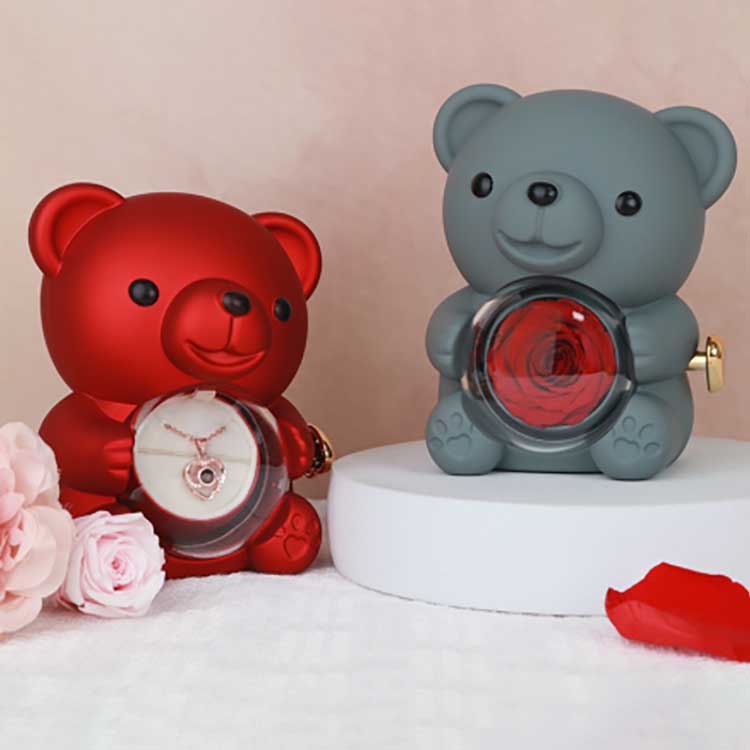 กล่องใส่เครื่องประดับ Hug Bear Rose ใช้สำหรับตั้งโชว์บนโต๊ะ ชั้นหนังสือ หรือโต๊ะข้างเตียง จุดเด่นที่สะดุดตาที่สุดคือดอกกุหลาบที่เก็บรักษาไว้ตรงกลาง เมื่อเปิดดอกกุหลาบออกมาจะมีช่องสำหรับเก็บเครื่องประดับ แหวน หรือของที่ระลึก