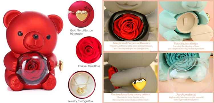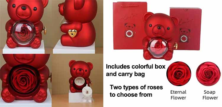 แตกต่างจากดอกไม้สบู่ หมีกอดเซอร์ไพรส์ดอกไม้สงวนของเราผลิตจากดอกไม้จริงสดที่ผ่านกระบวนการพิเศษต่างๆ เช่น การคายน้ำ การเก็บสี และการจัดรูปทรง ดอกไม้เหล่านี้คงความสมบูรณ์และรูปทรงของดอกไม้จริงไว้ได้นานกว่า! โดยปกติแล้วจะอยู่ได้ 3-5 ปี! ไม่ต้องรดน้ำ! พวกเขายังคงมีชีวิตชีวาและมีชีวิตชีวา! ให้ของขวัญอันทรงคุณค่านี้คงอยู่ตลอดไป!