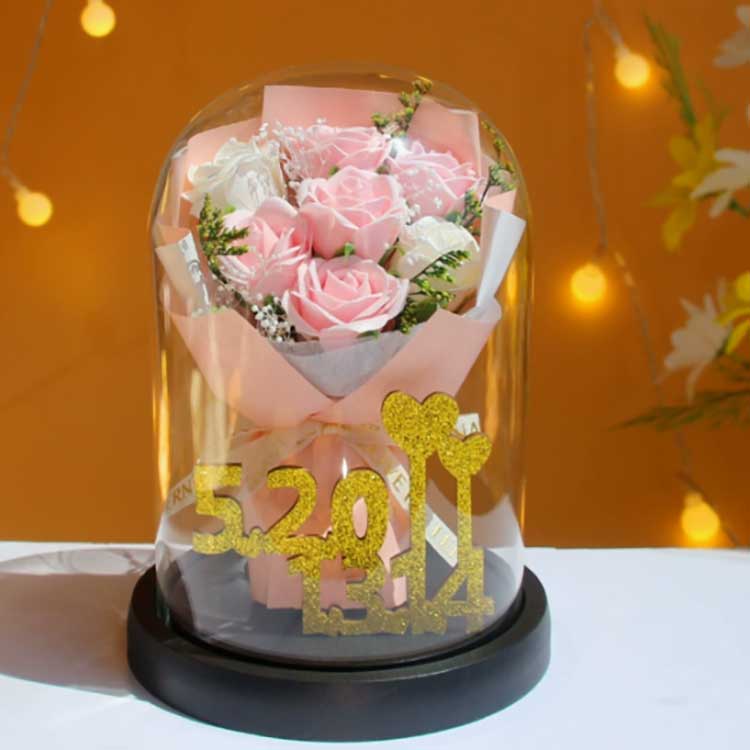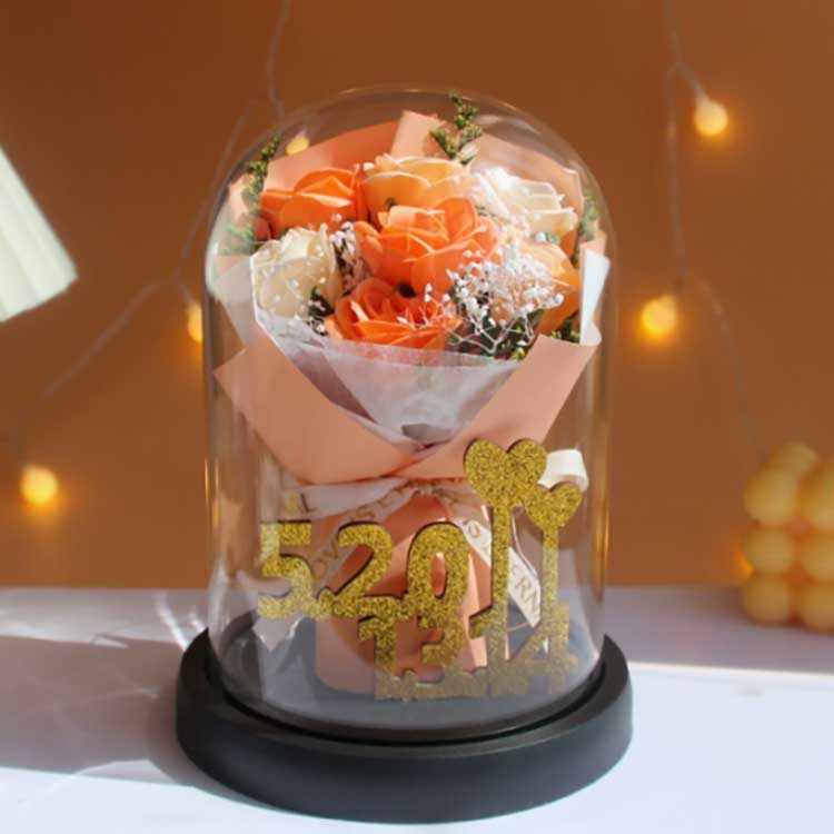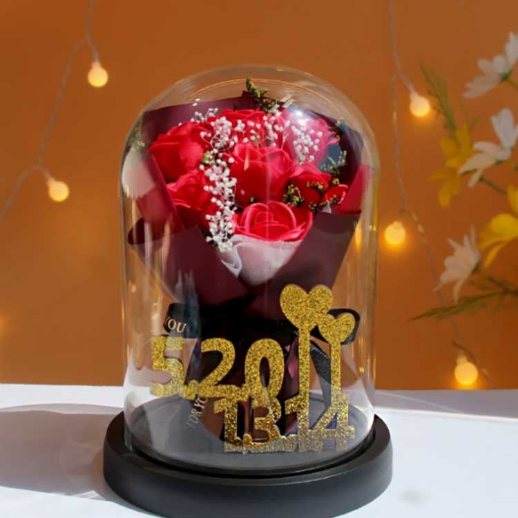 ช่อดอกกุหลาบแก้วนี้ออกแบบมาเพื่อป้องกันไม่ให้ดอกไม้เหี่ยวเฉา และดอกกุหลาบที่อยู่ข้างในจะไม่ซีดจาง ช่อดอกไม้นี้ดูราวกับมีชีวิตมาก เกือบจะแตกต่างจากดอกไม้จริงและสามารถนำเสนอความสวยงามของช่อดอกไม้ได้เป็นอย่างดี ภายในตัวเลขสีทอง 520+1314 แสดงถึงตัวเลข 520 และ 1314 ซึ่งเป็นสัญลักษณ์ของความรักและเน้นย้ำถึงความรอบคอบของของขวัญชิ้นนี้